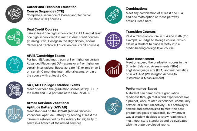 House Bill 1599 (2019) expanded the ways in which Washington students can develop their course plans and show their preparation for a meaningful first step after high school. Beginning with the Class of 2020, students must fulfill the pathway requirement to graduate, which must align with their High School and Beyond Plan. More information on the different pathways and requirements can be found on the image below and on the Washington State Board of Education's Graduation Pathway Options page.